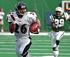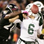 Baltimore’s three touchdowns on defense were the most in franchise history. Jameel McClain took a fumble by Sanchez six yards for a score on New York’s first offensive play, Jarret Johnson scored on a 26-yard fumble return and Lardarius Webb put the Ravens up 34-17 in the third quarter by taking an interception 73 yards into the end zone.